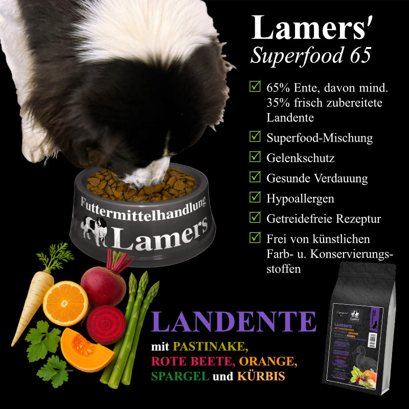 Jedes Lamers Superfood 65-Rezept enthält 65 % tierisches Eiweiß.