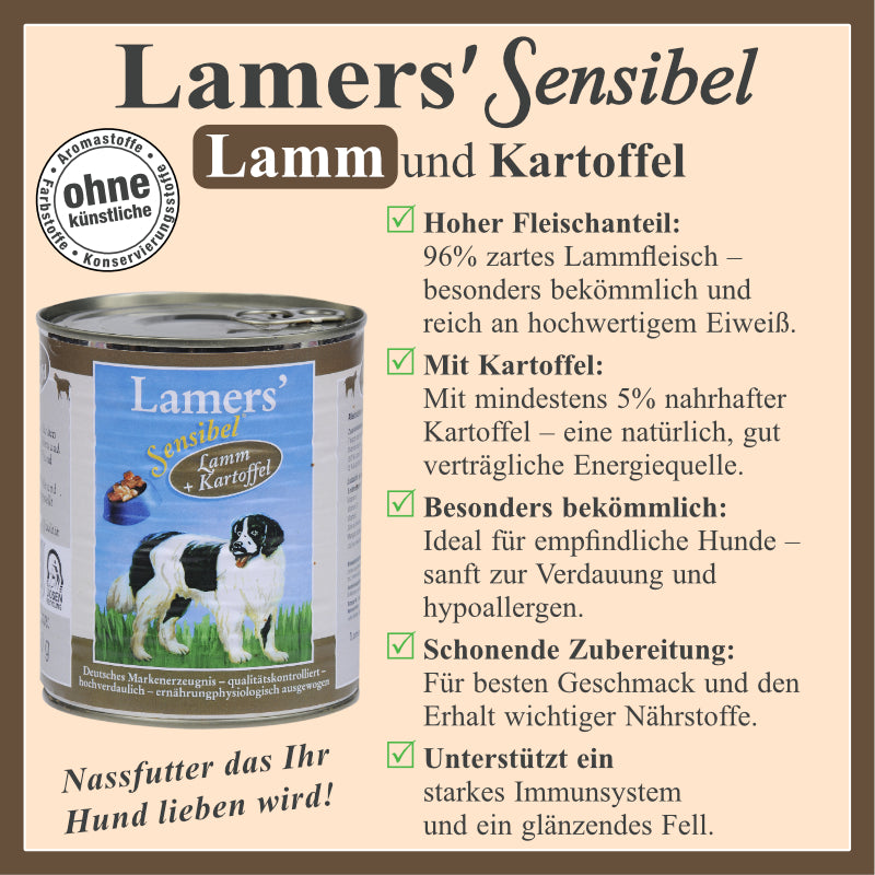 Lamers Sensibel Lamm & Kartoffel – Feiner Genuss für sensible FeinschmeckerMit "Lamers Sensibel Lamm & Kartoffel" schenken Sie Ihrem Hund eine besonders schonende und köstliche Mahlzeit. 96 % zartes Lammfleisch kombiniert mit mindestens 5 % nahrhaften Kartoffeln bieten eine ausgewogene Ernährung, die sanft zum Magen ist und pure Lebensfreude schenkt. Für glückliche Hunde und ein gesundes, aktives Leben – jeden Tag.