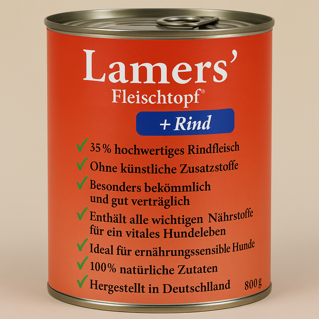 Schenken Sie Ihrem Hund pure Lebensfreude mit Lamers Fleischtopf Rind. 35 % saftiges Rindfleisch, ergänzt mit nährstoffreicher Leber, wertvollen Innereien, kräftigem Herz und hochwertigem Muskelfleisch – verfeinert mit sorgfältig ausgewählten Mineralstoffen. Schonend zubereitet zu einer natürlichen, saftigen Vollnahrung. Perfekt für alle ausgewachsenen Hunde, auch für sensible Feinschmecker.
